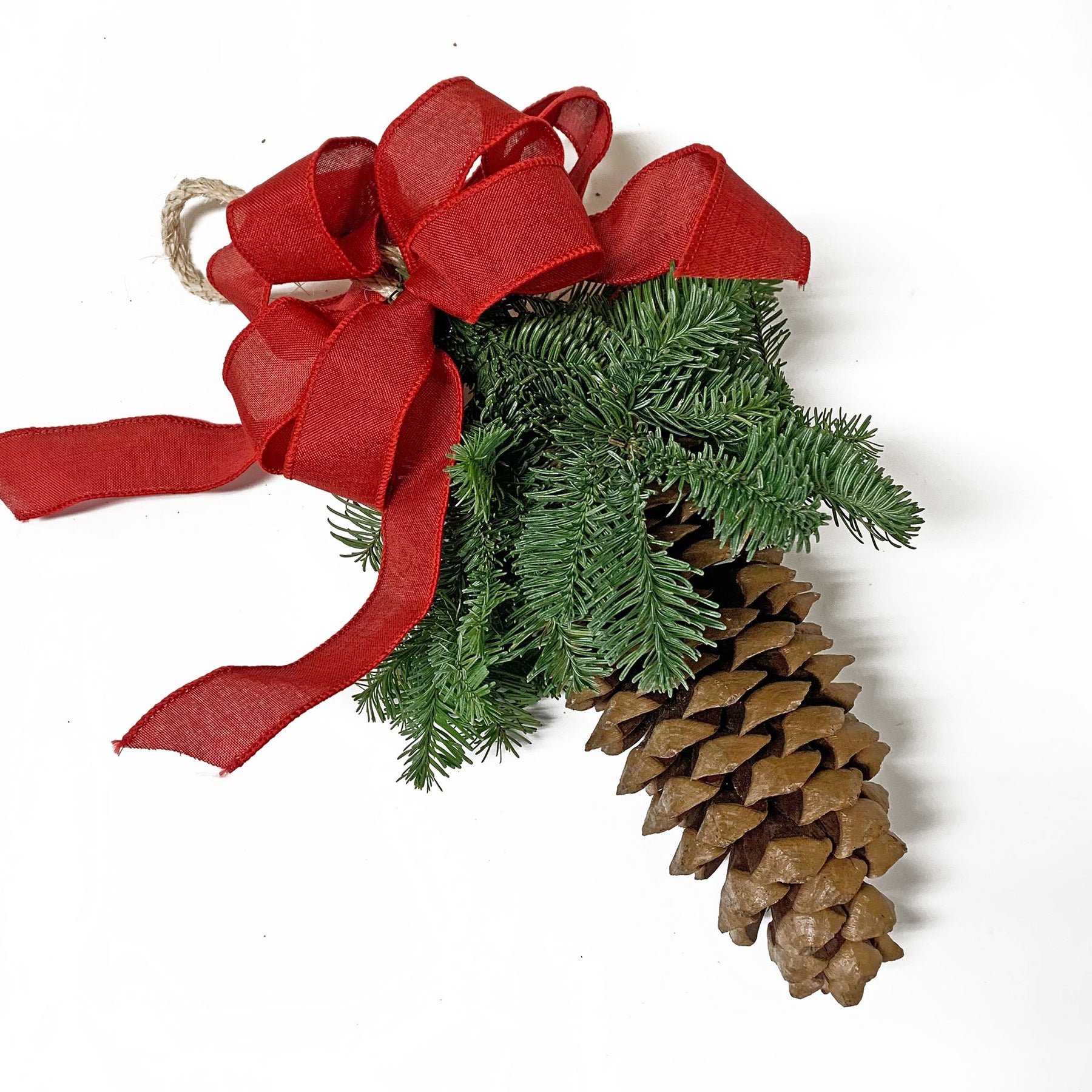 18" x 6" mixed greens and large sugarpine cone w/ ribbon - Sold Out