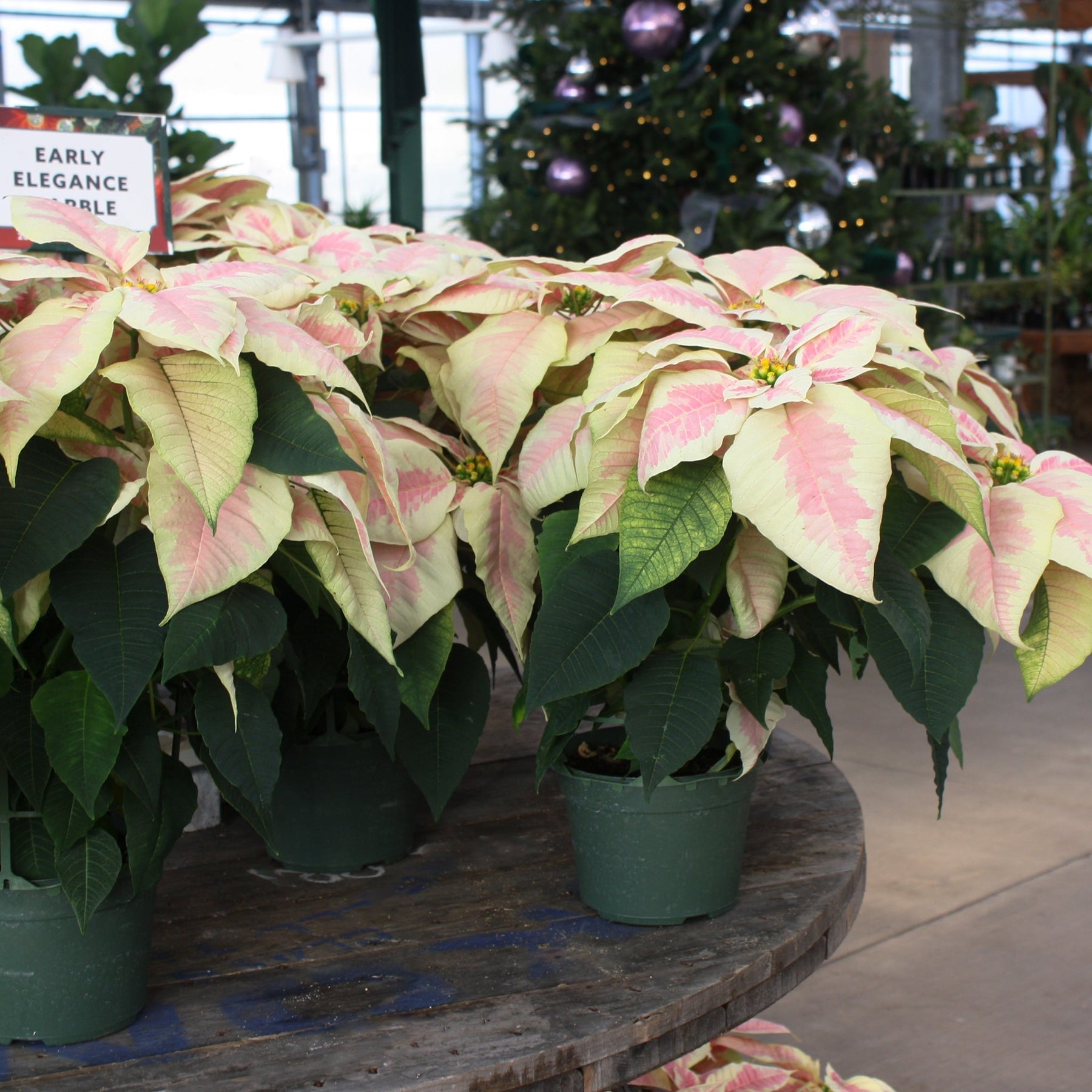 This stunning Early Elegance Marble Classic Poinsettia showcases unique marble-patterned bracts that blend creamy white with soft pink shades, adding a touch of elegance to any setting. Ideal for both holiday decorating and as a long-lasting indoor plant, its vibrant colors brighten up your home during the darker months. Easy to care for, this variety thrives with proper light and watering, making it a favorite among plant enthusiasts.