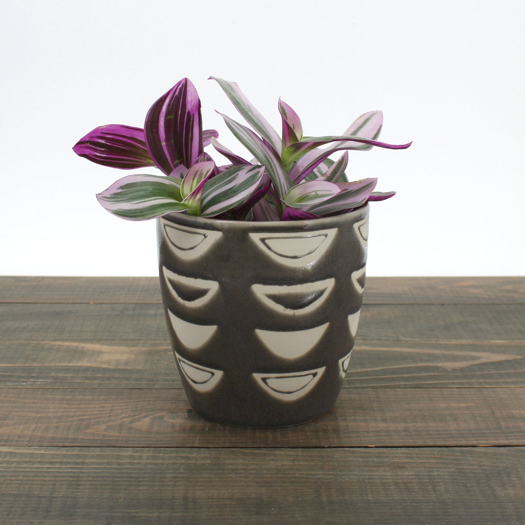 This stunning houseplant, known as the Nanouk Small-Leaf Tradescantia, boasts beautiful foliage with striking pink, green, and white variegation. Ideal for indoor spaces, it adds a splash of color to any room while being relatively easy to care for. Keep it in a bright spot away from direct sunlight to maintain its vibrant appearance and promote healthy growth.