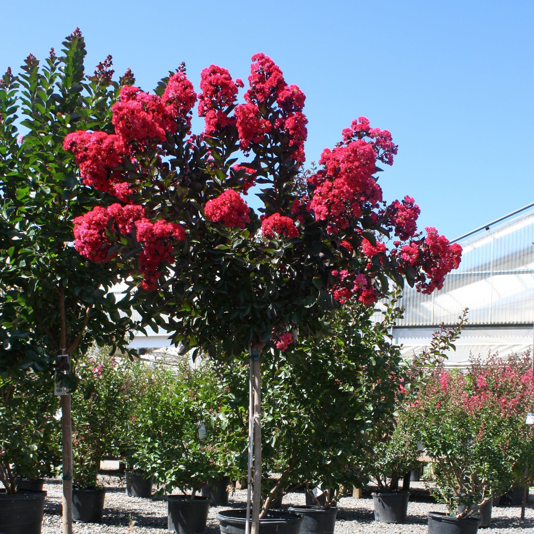 Sioux Crape Myrtle showcases stunning red flowers and glossy green foliage, making it an eye-catching addition to any garden. This hybrid variety is well-suited for the Portland Metro area's climate, offering beautiful blooms from summer to fall. Ideal for both residential landscapes and public gardens, 'Sioux' provides color and interest with its resilient nature.